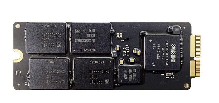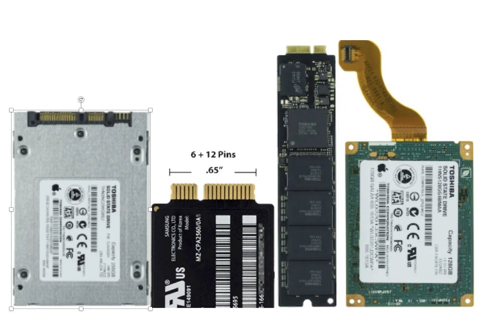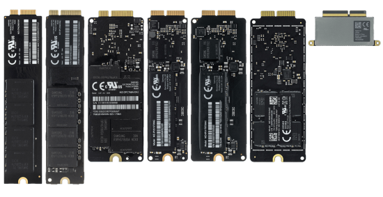 In late 2013, Apple again switched to MVMe PCIe SSD blades with Apple-specific pinouts that differ from the off-the-shelf M.2 standard PCIe blades that are readily available. To convert a regular blade, you can purchase small pinout adapters or buy Apple compatible modules from OWC, Feather, or Transcend.