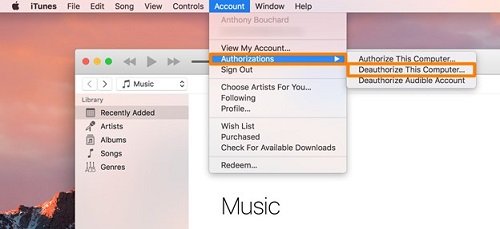 The next step is to deauthorize your iTunes store account through the Music application in macOS Catalina or iTunes. You have to go to the menu bar, then click on Account where you will find Authorizations. Click that and then click on deauthorize this computer. You will also have to deauthorize any third-party apps like Photoshop that are locked to your Mac.