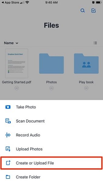 You first need to make an account on your iPhone to copy photos from iPhone to mac. Download the Dropbox app from the Apple store. After installing, open it and allow its access to your photos. Then tap on the + (create) button to upload photos from the menu. Select the photos which you need to transfer and store it in the Dropbox folder. Lastly, hit on the upload button.