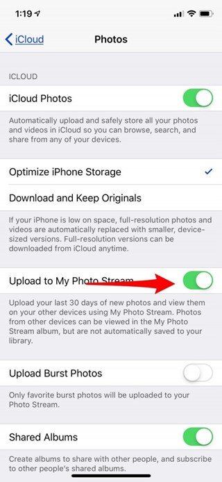 Figure 8: Swipe next to Upload to my Photostream to activate it