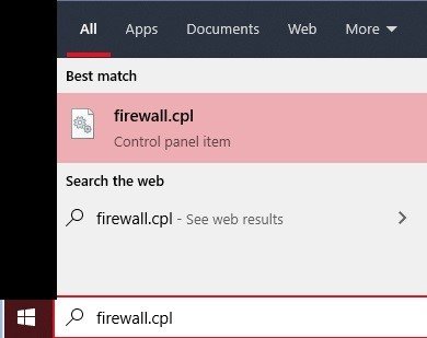 - Go to the Firewall menu in Control panel by Searching firewall.cpl in the search box in the taskbar or by pressing the Control + Esc keys at the same time.