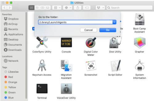 7. Go to /Library/LaunchAgents by typing it in the folder search dialog.