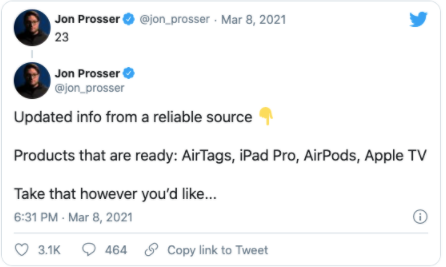 Jon Prosser, a well-known Apple, and Android leaker hinted in one of his tweets that we can anticipate several products on Apple’s latest listing and they are AirTags, iPad Pro, AirPods, and Apple TV.